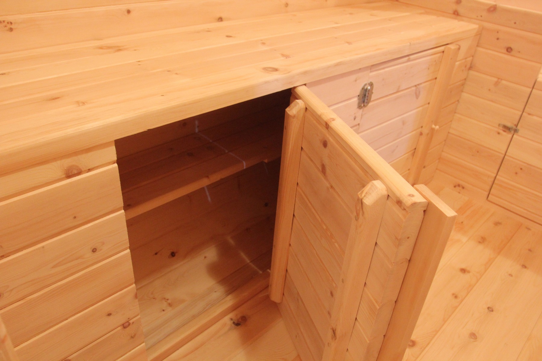 Откидная лавка с ящиком позволяет рационально использовать всё место под лавками в раздевалке, будь это дрова или что-то другое.