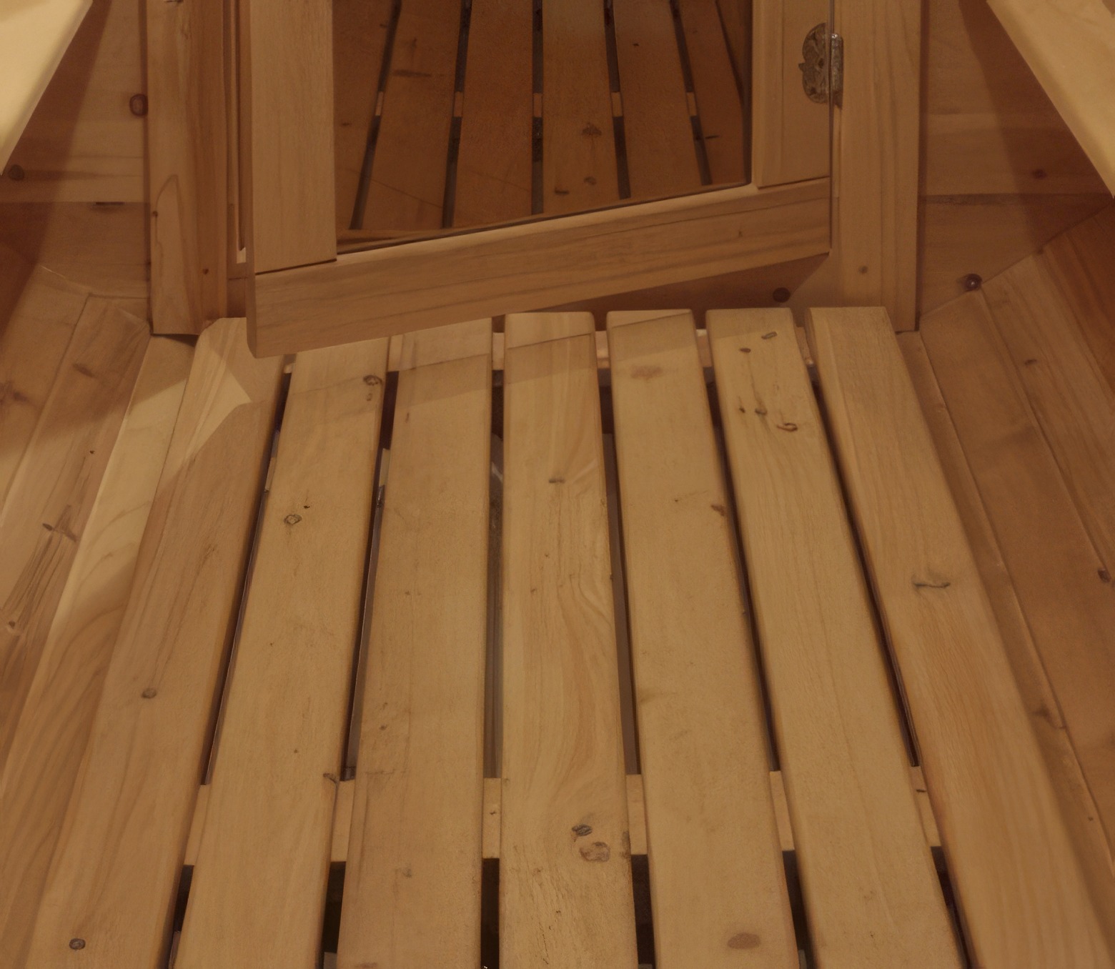 Это самая просторная модель бани. Благодаря этому ее можно использовать не только по назначению, но и в качестве летнего домика. Боковой вход у такой модели находится в начале или в середине конструкции. Моечная оснащена душевым поддоном. Двухуровневый открытый полок и лавочка в парилке сделает принятие процедур более комфортным. По вашему желанию баню-бочку можно дополнить печью с внешней загрузкой, благодаря которой весь мусор после топки останется на улице. Баня-бочка буханка из кедра с боковым входом не требует полноценный фундамент, поэтому при необходимости ее можно перенести в другое место.