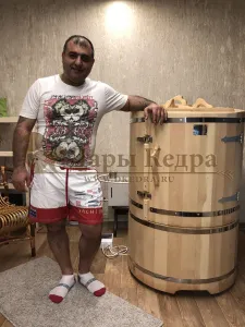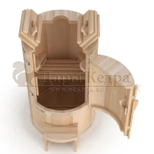 Круглая фитобочка из кедра - это мини парная, которую можно использовать не только в спа-салонах, но и дома. Такая модель наиболее компактна и мобильна. Толщина стенок составляет 25 мм. Фитобочка оборудована откидными створками, дверцей и отверстием для головы. Во время парения человек сидит внутри кедровой бочки, а голова находится снаружи. Благодаря этому исключается возможность перегрева. Подлокотники из кедра, встроенные ручки на створках и двери делают эксплуатацию более удобной.