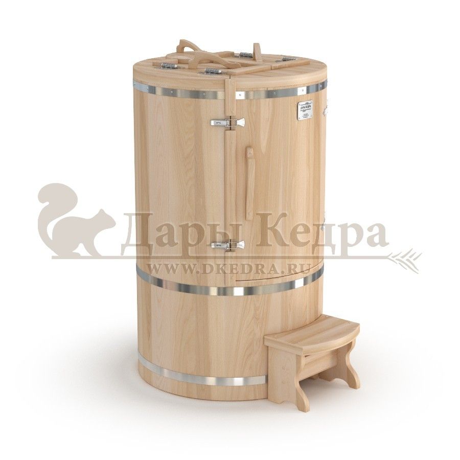 Кедровая бочка (фитобочка) овальная «Классическая» Овальная фитобочка из кедра - это мини парная, которую можно использовать не только в спа-салонах, но и дома. Овальная модель более просторна и удобна в использовании. Толщина стенок составляет 25 мм. Она оборудована откидными створками, дверцей и отверстием для головы. Во время парения человек сидит внутри кедровой бочки, а голова находится снаружи. Благодаря этому исключается возможность перегрева. Подлокотники из кедра, встроенные ручки на створках и двери делают эксплуатацию более удобной. Парение в фитобочке благотворно влияет на организм в целом: повышается иммунитет, выводятся шлаки и токсины, улучшается работа органов тела и состояние кожи.