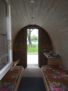Такой кемпинг дом удобное и практичное решение для дачного использования или обустройства загородных баз отдыха. Изготовлен из хвойных пород древесины. Кровля из мягкой черепицы и цельный навес по всему фасаду изделия обеспечивают защиту от осадков. Домик включает в себя одну комнату с двумя кроватями, для удобства пользования оборудован навесным столиком, полкой и вешалкой. Входная дверь изготовлена из двойного стеклопакета.