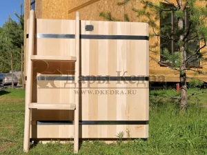 Это квадратная емкость для воды из кедра. Она предназначена для отдыха и охлаждения тела после банных процедур. Благодаря своей форме купель хорошо впишется в угол помещения, так же ее можно установить на улице. Квадратная купель оснащена лавочками, приставной и внутренней лестницей из кедра. За счет стяжных болтов обручи из нержавеющей стали плотно прилегают к кедровой купели. Это позволяет равномерно распределять нагрузку воды и сохранить форму изделия в период эксплуатации. При правильном уходе купель для бани не рассыхается и не подвергается гниению.