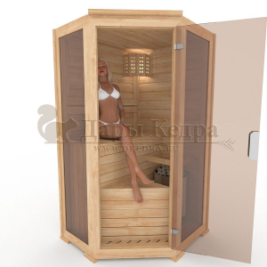 Это специально оборудованная деревянная кабина для сухого и влажного парения. Электропечь нагревает пространство внутри и позволяет сбрызгивать камни водой, слегка увлажняя воздух. Такая процедура позволяет избежать перегрева. Двойные стенки кабины с теплоизоляционным материалом удерживают тепло. Установка сауны в угол позволяет рационально использовать пространство помещения. Финская сауна с электропечью подойдет как для домашнего использования, так и для коммерции. Доставляется в разборном виде щитами, собирается по инструкции с помощью шуруповёрта.